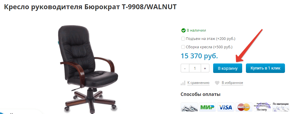 - Сначала вам необходимо добавить выбранный товар в корзину, для этого нажмите на кнопку «В корзину» в каталоге: